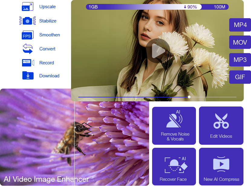 Réduisez la taille de la vidéo jusqu'à 90%, par exemple de 1 Go à 100 Mo |