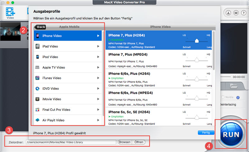 Schritt 3: Ausgabeformat wählen. Wählen Sie ein Ausgabeformat von der Dropdown-Liste und klicken Sie auf "Fertig". Legen Sie einen Zielordner mit einem Klick auf "Browsen" fest. Dann klicken Sie auf "Run", um den Vorgang zu starten.