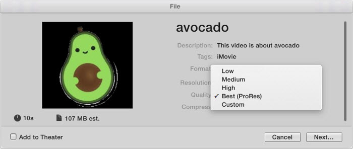 iMovie's High Quality setting facilitates the conversion of VOB files to MP4 on Mac. Simply import your .vob files into iMovie and proceed to export them. The resulting files will be in MP4/AAC format across all iMovie settings except for Best Quality (pro res), which yields a file size four times larger than the MP4 due to its significantly higher bitrate. Therefore, for space efficiency, it's recommended to use the High Quality setting rather than Best Quality (pro res).