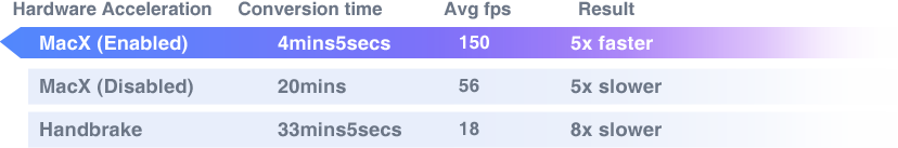 Here we take a 30fps 4K Ultra HD video source as an example. When the GPU hardware encoding is enabled on MacX, your 4K video processing will be running at 150fps and your video encoding on this is 5X real time faster than the disabled version. As for Handbrake, it encodes this input source at 18fps, 8X slower than MacX on account of QuickSync/GPU hardware encoding unsupported in Mac version.