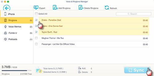Kreuzen Sie die Klingeltöne, die Sie auf iPhone übertragen, oder wählen Sie einfach "Select All". Dann klicken Sie auf den Button "Sync". So lässt sich Musik als Klingelton für iPhone downloaden und einstellen ohne iTunes.
