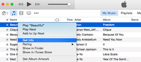 Schritt 3: Klicken Sie mit der rechten Maustaste auf das Lied und gehen Sie zu "Get Info" > "Options". Dann können Sie ein "Start" und "Stop" Feld sehen, damit Nutzer die Start- und Stop-Zeit des neuen iPhone Klingelton erstellen können.