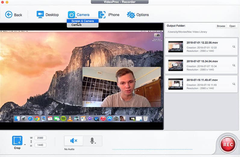 Note: you would have noticed that there is another option under "Camera" - screen & camera. This option is aimed to help you record your face and screen video on Mac, which is practical for creating tutorials or online lessons/lectures for students. The detailed processing steps are much of muchness. Needless to repeat it. Select it when tutorial/lesson recording is needed.